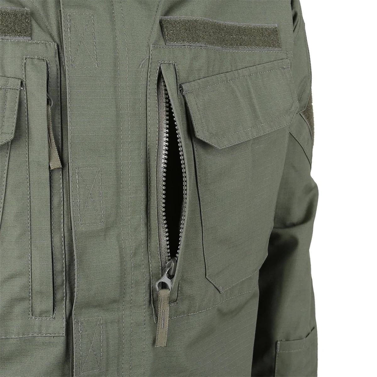 Центральная застежка — тракторная пластиковая молния с удобной ухваткой из тесьмы. Молния прикрывается планкой на липучках