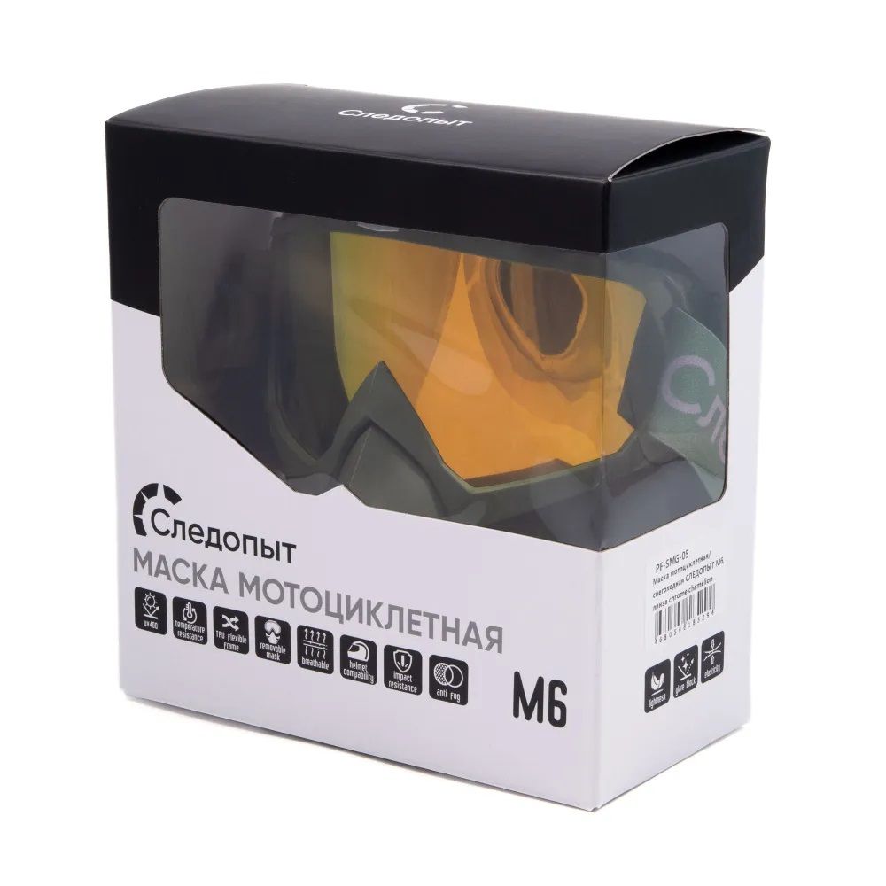 Маска СЛЕДОПЫТ М6 не скользит и не съезжает так как оснащена регулируемым ремнём с силиконовыми полосками, подходит для шлема и головы любого размера. Маска актуальна для использования летом: катание на мотоциклах, квадроциклах, картинге и велоспорта; и зимой - для катания на снегоходе, сноубординга и горнолыжного спорта. Корпус маски выполнен по технологии TPU flexible frame — это гибкая рамка из термопластичного полиуретана (ТПУ). Этот материал обладает хорошей прочностью, устойчивостью к истиранию и эластичностью.